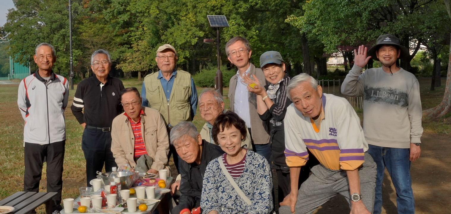 中央公園にて- 原則年一回都立公園等のバーベキュー広場に集まって、冷えた生ビール・ウィスキー・白赤ワイン・日本酒などを楽しみながら、苦労して着けた炭火で焼き上がった肉・野菜そして定番の焼きそばを堪能しています。