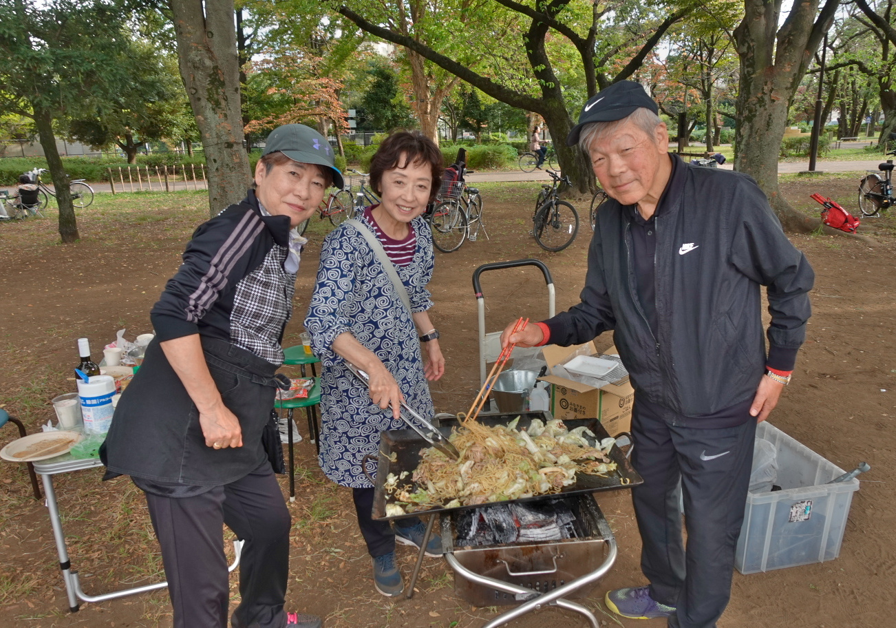 中央公園にて- 原則年一回都立公園等のバーベキュー広場に集まって、冷えた生ビール・ウィスキー・白赤ワイン・日本酒などを楽しみながら、苦労して着けた炭火で焼き上がった肉・野菜そして定番の焼きそばを堪能しています。
